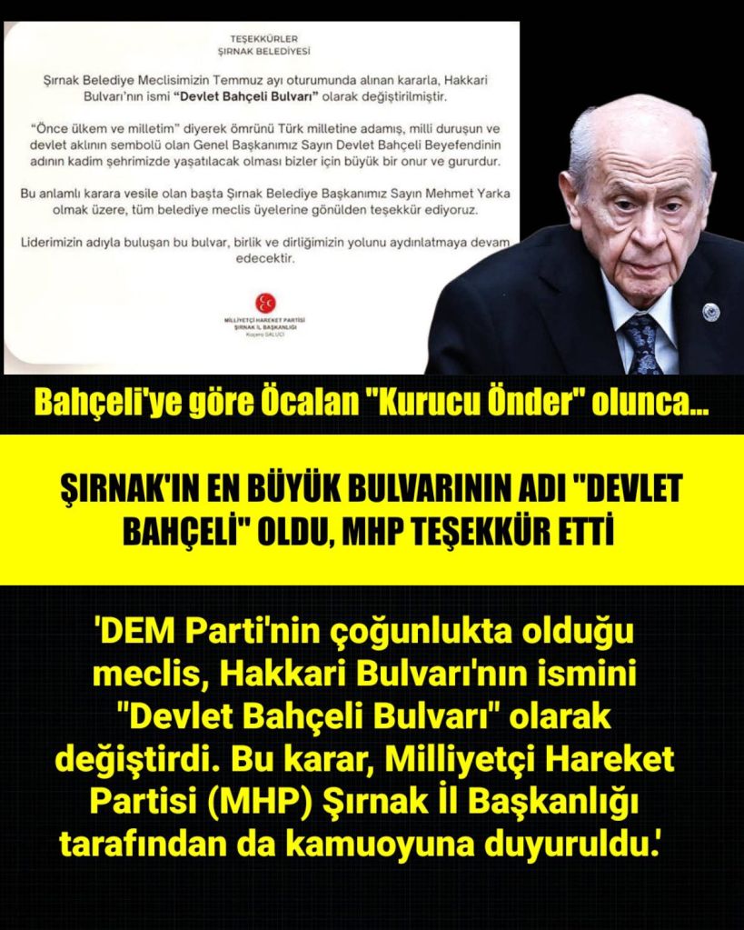 DEM Parti’nin çoğunlukta olduğu meclis, Hakkari Bulvarı’nın ismini “Devlet Bahçeli Bulvarı” olarak değiştirdi. Bu karar, Milliyetçi Hareket Partisi (MHP) Şırnak İl Başkanlığı tarafından da kamuoyuna duyuruldu.