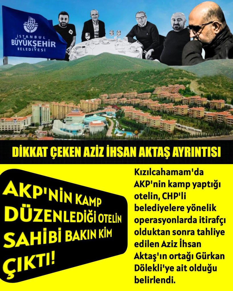 Kızılcahamam’da AKP’nin kamp yaptığı otelin, CHP’li belediyelere yönelik operasyonlarda itirafçı olduktan sonra tahliye edilen Aziz İhsan Aktaş’ın ortağı Gürkan Dölekli’ye ait olduğu belirlendi.