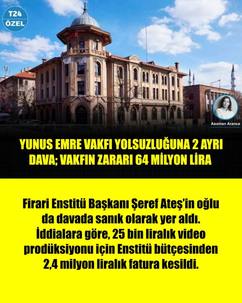 Türk dil ve kültürünü tanıtmak amacıyla 2007 yılında kurulan ve 66 ülkede faaliyet gösteren “kamu vakfı” niteliğindeki Yunus Emre Vakfı’na bağlı enstitüdeki “naylon fatura” skandalına ilişkin soruşturmanın ilk ayağı tamamlandı. Ankara Cumhuriyet Başsavcılığı, aralarında vakfın Özel Kalem Müdürü Mustafa Duru, Destek Hizmetleri Dairesi Başkanı Murat Çakır ve firari eski Başkan Şeref Ateş’in oğlu Enes Ateş’in de bulunduğu 23 kişi hakkında 2 ayrı dava açtı. Görevden alınmasından üç gün önce Almanya’ya kaçtığı ortaya çıkan eski Vakıf Başkanı Şeref Ateş’in dosyası ise firari olması nedeniyle ayrıldı.