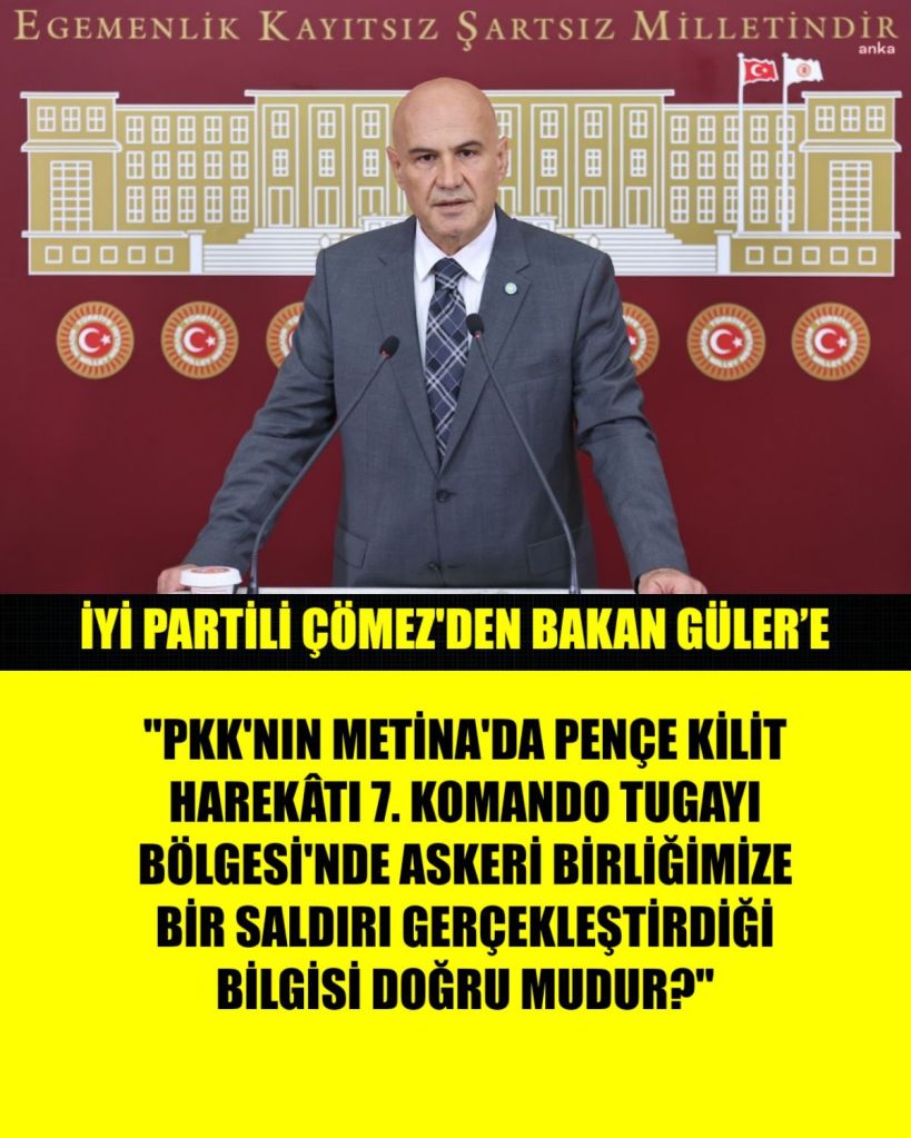 İYİ Parti Grup Başkanıvekili Turhan Çömez, Milli Savunma Bakanı Yaşar Güler’e, “Alçak terör örgütü PKK’nın Irak’ın genişlemiş, Metina’da Pençe Kilit Harekâtı 7. Komando Tugayı Bölgesi’nde askeri birliğimize bir saldırının yapıldığı bilgisi doğru mudur? Bu saldırının dronelarla ve keskin nişancılarla gerçekleştirildiği bilgisi doğru mudur? Bahse konuda 2 askerimizin yaralandığı bilgisi doğru mudur” diye sordu.