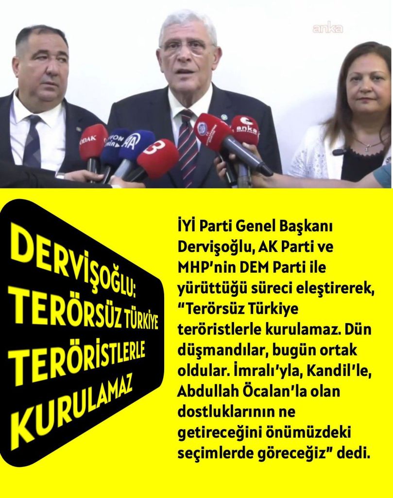 İYİ Parti Genel Başkanı Dervişoğlu, AK Parti ve MHP’nin DEM Parti ile yürüttüğü süreci eleştirerek, “Terörsüz Türkiye teröristlerle kurulamaz. Dün düşmandılar, bugün ortak oldular. İmralı’yla, Kandil’le, Abdullah Öcalan’la olan dostluklarının ne getireceğini önümüzdeki seçimlerde göreceğiz” dedi.
