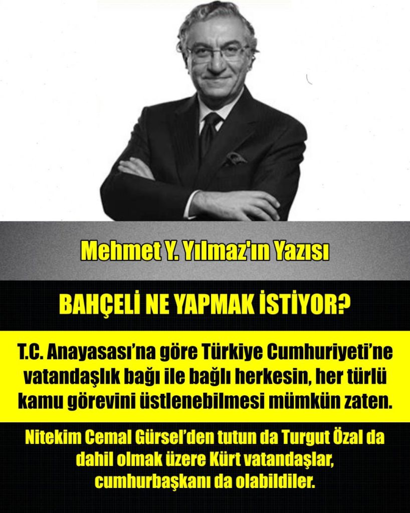 Yıldıray Bey’in sözünü ettiği “vatanına, bayrağına ve ülke değerlerine bağlı Kürt ve Alevi kardeşlerimizin her türlü temsil makamında yer alabileceği” meselesi ile Bahçeli’nin sözünü ettiği “Cumhurbaşkanı’nın iki yardımcısı olsun, biri Kürt, diğeri Alevi olsun” konusu birbirinden siyah ile beyaz kadar farklı konular.