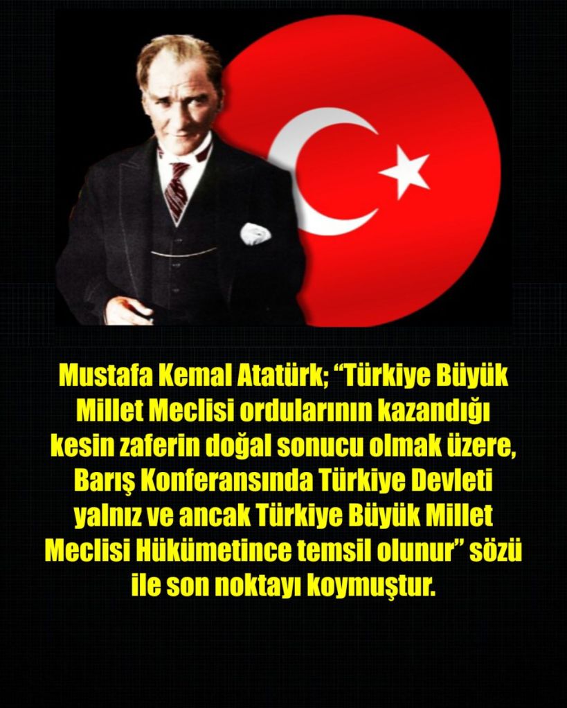 Mustafa Kemal Atatürk; “Türkiye Büyük Millet Meclisi ordularının kazandığı kesin zaferin doğal sonucu olmak üzere, Barış Konferansında Türkiye Devleti yalnız ve ancak Türkiye Büyük Millet Meclisi Hükümetince temsil olunur” sözü ile son noktayı koymuştur.