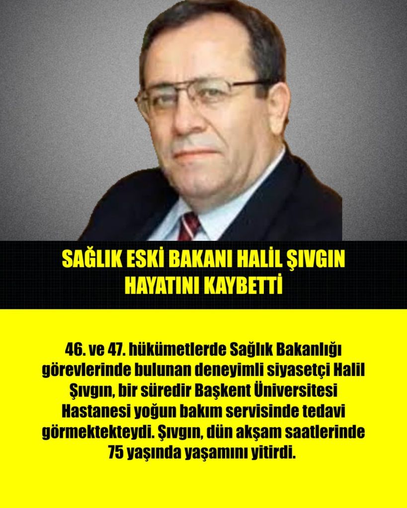- ve 47. hükümetlerde Sağlık Bakanlığı görevlerinde bulunan deneyimli siyasetçi Halil Şıvgın, bir süredir Başkent Üniversitesi Hastanesi yoğun bakım servisinde tedavi görmektekteydi. Şıvgın, dün akşam saatlerinde 75 yaşında yaşamını yitirdi.