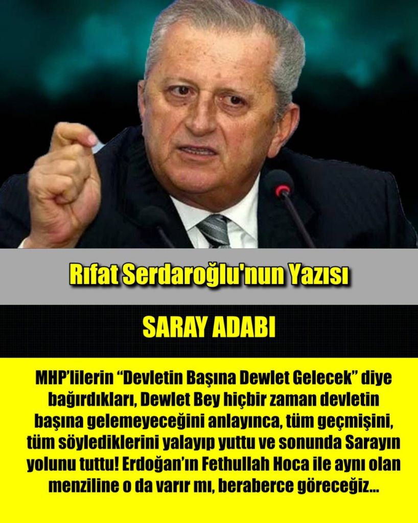MHP’lilerin “Devletin Başına Dewlet Gelecek” diye bağırdıkları, Dewlet Bey hiçbir zaman devletin başına gelemeyeceğini anlayınca, tüm geçmişini, tüm söylediklerini yalayıp yuttu ve sonunda Sarayın yolunu tuttu! Erdoğan’ın Fethullah Hoca ile aynı olan menziline o da varır mı, beraberce göreceğiz…