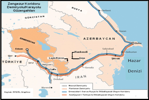 Zengezur Koridoru’nun açılması, ikinci grupta bulunan ülkelerin ulaşım haritasını değiştirecektir. Azerbaycan ile Türkiye arasında karayolu irtibatı sağlanacak ve Azerbaycan üzerinden Ermenistan ile Rusya arasında demiryolu hattı inşa edilecektir. Diğer bir ifade ile Zengezur Koridoru hem Azerbaycan ile Türkiye’yi hem de Ermenistan ile Rusyayı birleştirecektir. Ayrıca modern tarihte ilk defa Rusya ve Türkiye demiryolu bağlantısına (Dağıstan-Azerbaycan-Zengezur-Türkiye) sahip olacaktır (Şekil-1). İran’ın, Zengezur üzerinden Gürcistan’a ve oradan Rusya’ya erişimi devam edecektir. Türk Cumhuriyetlerinin ve Türkiye’nin Hazar Denizi veya Rusya-Azerbaycan üzerinden birbirlerine irtibatlanması mümkün olacaktır. Kazakistan ve Türkmenistan’ın hidrokarbon kaynakları Zengezur üzerinden Türkiye’ye ve daha Batı’ya aktarılabilecektir. Zengezur Koridoru ile doğrudan ilişkili olarak, Hazar Denizine kıyıdaş iki Türk Cumhuriyeti aralarındaki anlaşmazlığa son vermiştir. Azerbaycan’ın “Kepez”, Türkmenistan’ın ise “Serdar” adını verdiği sahayla ilgili anlaşmazlık, “Dostluk” başlığı ile sloganlaştırılarak çözülmüştür. Böylece iki ülke arasında, Hazar Denizi üzerinde bir enerji koridorunun önü açılmıştır.
