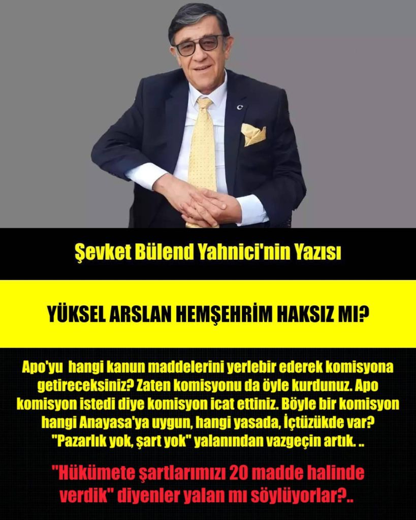 CHP’liler dahil, komisyona Apo’nun tavsiyesi ile hayat verenler ( Kurtulmuş, AKP, MHP, DEM yöneticileri) Yüksel Arslan hemşehrimi adeta topa tuttular. Veryansın ettiler.