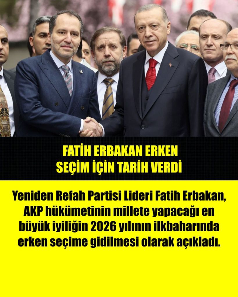 Yeniden Refah Partisi Lideri Fatih Erbakan, AKP hükümetinin millete yapacağı en büyük iyiliğin 2026 yılının ilkbaharında erken seçime gidilmesi olarak açıkladı.