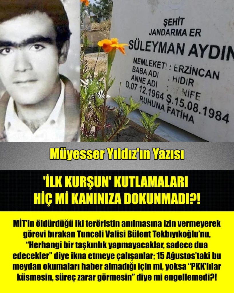 MİT’in öldürdüğü iki teröristin anılmasına izin vermeyerek görevi bırakan Tunceli Valisi Bülent Tekbıyıkoğlu’nu, “Herhangi bir taşkınlık yapmayacaklar, sadece dua edecekler” diye ikna etmeye çalışanlar; 15 Ağustos’taki bu meydan okumaları haber almadığı için mi, yoksa “PKK’lılar küsmesin, süreç zarar görmesin” diye mi engellemedi?!