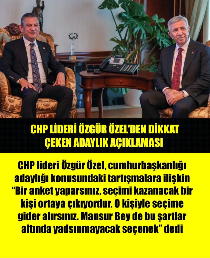 “Ben kendimi adaylaştırmanın adil bir seçimin önüne geçeceğini düşünüyorum. Çünkü insanlar, kendilerinin adaylık ihtimali olduğu zaman birazcık objektif bakış açısını kaybeder. Ben daha önce de söylemiştim ve bu sözümü bir kez yerine getirdim. Mümkün olan en geniş katılımda en doğru adayı belirleyeceğiz, demiştik. 23 Mart günü 15,5 milyon kişi oy kullandı. Yani Ekrem İmamoğlu ne benim ne partinin, resmen Türkiye’nin adayı oldu. Ben kendimi bir seçenek olarak tutup diğer formüllerin önünü tıkamak istemem. Mümkün olan en katılımcı, en doğru yöntemle, bu bazen illa yeniden sandık koymak değildir. Bir anket yaparsınız, seçimi kazanacak bir kişi ortaya çıkıyordur. O kişiyle seçime gider alırsınız. Mansur Bey de bu şartlar altında yadsınmayacak seçenektir.”