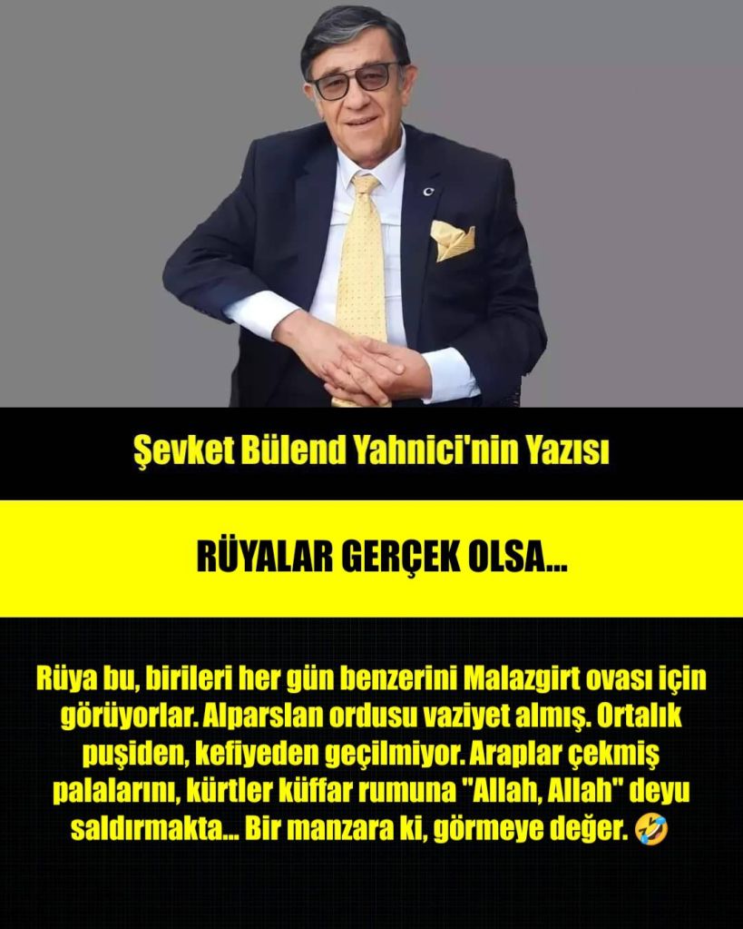 Rüya bu, birileri her gün benzerini Malazgirt ovası için görüyorlar. Alparslan ordusu vaziyet almış. Ortalık puşiden, kefiyeden geçilmiyor. Araplar çekmiş palalarını, kürtler küffar rumuna “Allah, Allah” deyu saldırmakta… Bir manzara ki, görmeye değer. 🤣