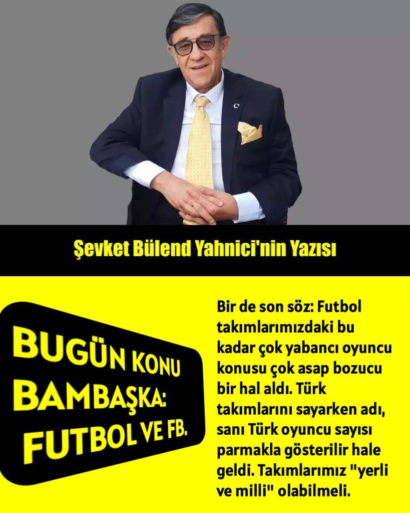 Bir de son söz: Futbol takımlarımızdaki bu kadar çok yabancı oyuncu konusu çok asap bozucu bir hal aldı. Türk takımlarını sayarken adı, sanı Türk oyuncu sayısı parmakla gösterilir hale geldi. Takımlarımız “yerli ve milli” olabilmeli.