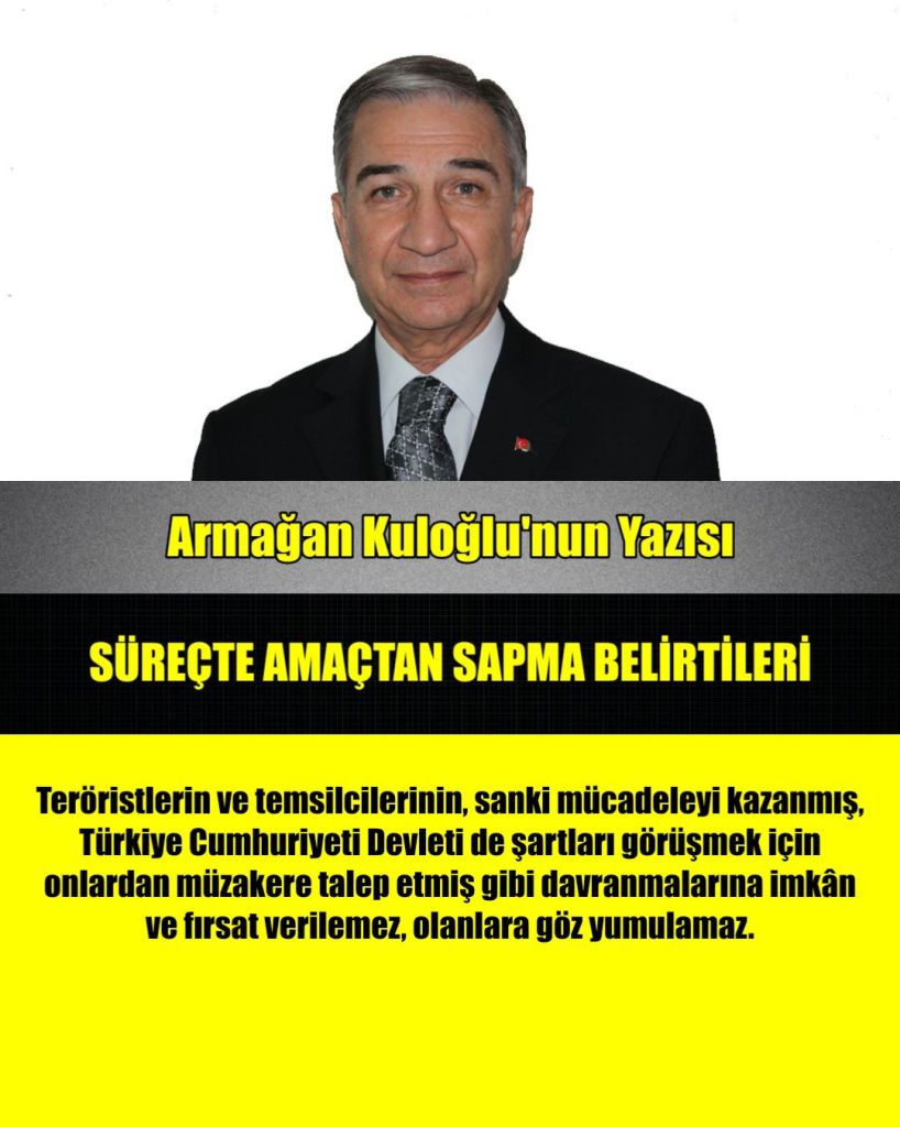 -Türkiye Cumhuriyeti terörle mücadele etmiş, bedel ödeyerek ülkeyi böldürmemiştir. Terörle müzakere değil, mücadele edilir. Diz çöktürülür. Silahlarıyla birlikte teslim alınır. Adli mercilere sevk edilir. Yargılanır. Yargının vereceği kararlara göre hareket edilir. 40 bin kişinin katiline sayın/önder/baş müzakereci vs. denmez, terörist denir. Yaşanan süreçte, PKK terör örgütünün göstermelik değil, tam olarak silah bırakması ve faillerin yargıya sevk edilmesi gerekir. Elindeki silahları, PYD ve PJAK’a devretmesi, bir kısım teröristlerin de onlara katılması kabul edilemez. KCK’nın tüm unsurlarıyla ortadan kalkması sağlanmadıkça süreç sonuca ulaşmış sayılmaz.