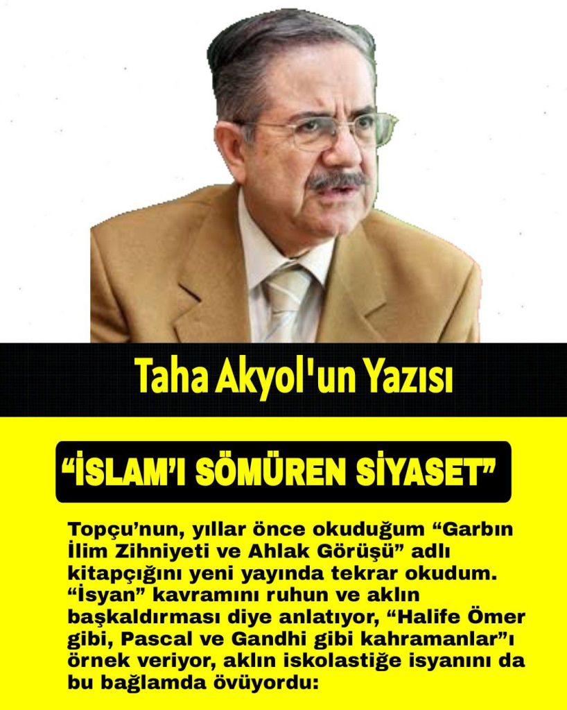 Topçu’nun, yıllar önce okuduğum “Garbın İlim Zihniyeti ve Ahlak Görüşü” adlı kitapçığını yeni yayında tekrar okudum. “İsyan” kavramını ruhun ve aklın başkaldırması diye anlatıyor, “Halife Ömer gibi, Pascal ve Gandhi gibi kahramanlar”ı örnek veriyor, aklın iskolastiğe isyanını da bu bağlamda övüyordu: