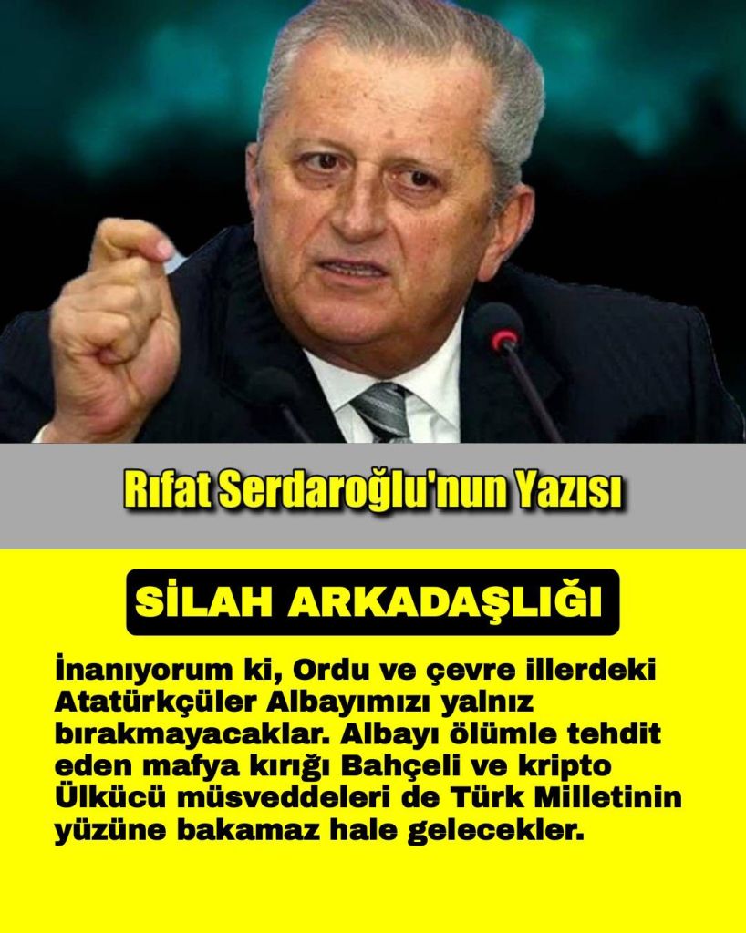 İnanıyorum ki, Ordu ve çevre illerdeki Atatürkçüler Albayımızı yalnız bırakmayacaklar. Albayı ölümle tehdit eden mafya kırığı Bahçeli ve kripto Ülkücü müsveddeleri de Türk Milletinin yüzüne bakamaz hale gelecekler.