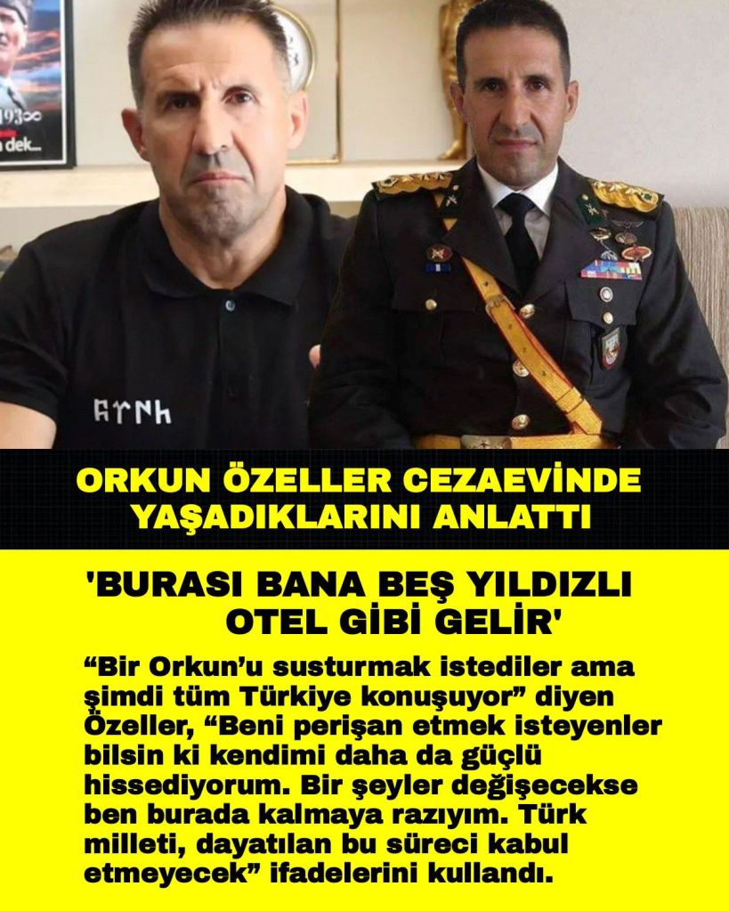 Yeni açılım sürecinin mimarı MHP lideri Devlet Bahçeli’ye yönelik eleştirileri sonrası Ülkü Ocakları tarafından tehdit edilen ve Bahçeli’nin şikayeti sonrası tutuklanan emekli Albay Orkun Özeller, cezaevinde yaşadıklarını “Dibi kirden tamamen sararmış tastan su içtim, bana etki etmez. Burası bana beş yıldızlı otel gibi gelir” sözleriyle anlattı.