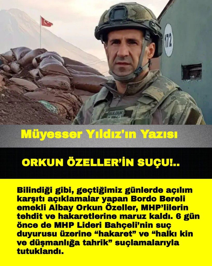 Bilindiği gibi, geçtiğimiz günlerde açılım karşıtı açıklamalar yapan Bordo Bereli emekli Albay Orkun Özeller, MHP’lilerin tehdit ve hakaretlerine maruz kaldı. 6 gün önce de MHP Lideri Bahçeli’nin suç duyurusu üzerine “hakaret” ve “halkı kin ve düşmanlığa tahrik” suçlamalarıyla tutuklandı.