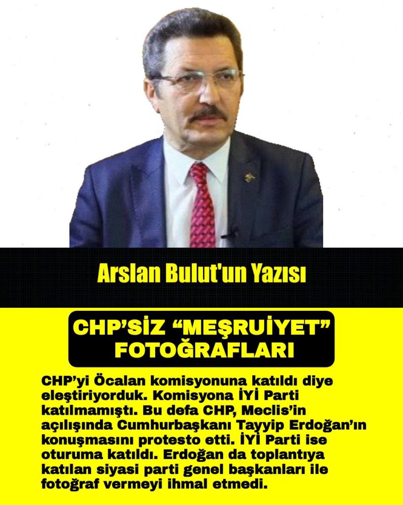 CHP’yi Öcalan komisyonuna katıldı diye eleştiriyorduk. Komisyona İYİ Parti katılmamıştı. Bu defa CHP, Meclis’in açılışında Cumhurbaşkanı Tayyip Erdoğan’ın konuşmasını protesto etti. İYİ Parti ise oturuma katıldı. Erdoğan da toplantıya katılan siyasi parti genel başkanları ile fotoğraf vermeyi ihmal etmedi.
