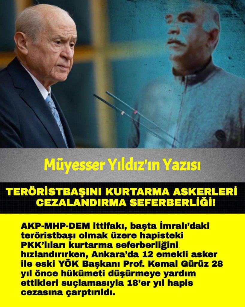 AKP-MHP-DEM ittifakı, başta İmralı’daki teröristbaşı olmak üzere hapisteki PKK’lıları kurtarma seferberliğini hızlandırırken, Ankara’da 12 emekli asker ile eski YÖK Başkanı Prof. Kemal Gürüz 28 yıl önce hükümeti düşürmeye yardım ettikleri suçlamasıyla 18’er yıl hapis cezasına çarptırıldı.