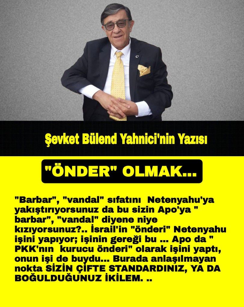 “Barbar”, “vandal” sıfatını Netenyahu’ya yakıştırıyorsunuz da bu sizin Apo’ya ” barbar”, “vandal” diyene niye kızıyorsunuz?.. İsrail’in “önderi” Netenyahu işini yapıyor; işinin gereği bu … Apo da ” PKK’nın kurucu önderi” olarak işini yaptı, onun işi de buydu… Burada anlaşılmayan nokta SİZİN ÇİFTE STANDARDINIZ, YA DA BOĞULDUĞUNUZ İKİLEM. ..