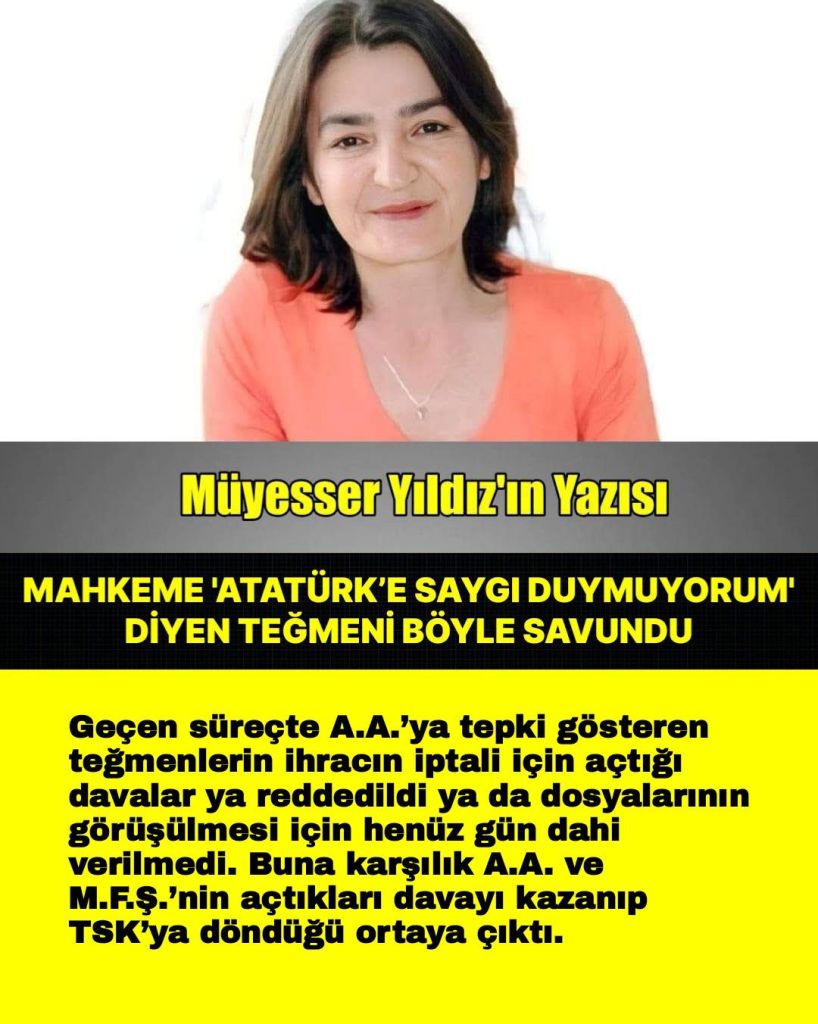 Tuzla Piyade Okulu’nda 2023’teki 10 Kasım Atatürk’ü Anma Töreni’nde “tarikatçı” olduğu belirtilen Teğmen A.A.’nın yakasına Atatürk fotoğrafı takmak istememesi üzerine yaşananları hatırlarsınız. Hem A.A.’ya tepki gösteren teğmenler hem de A.A. ve ona destek veren M.F.Ş. ile F.A. TSK’dan ihraç edildi.