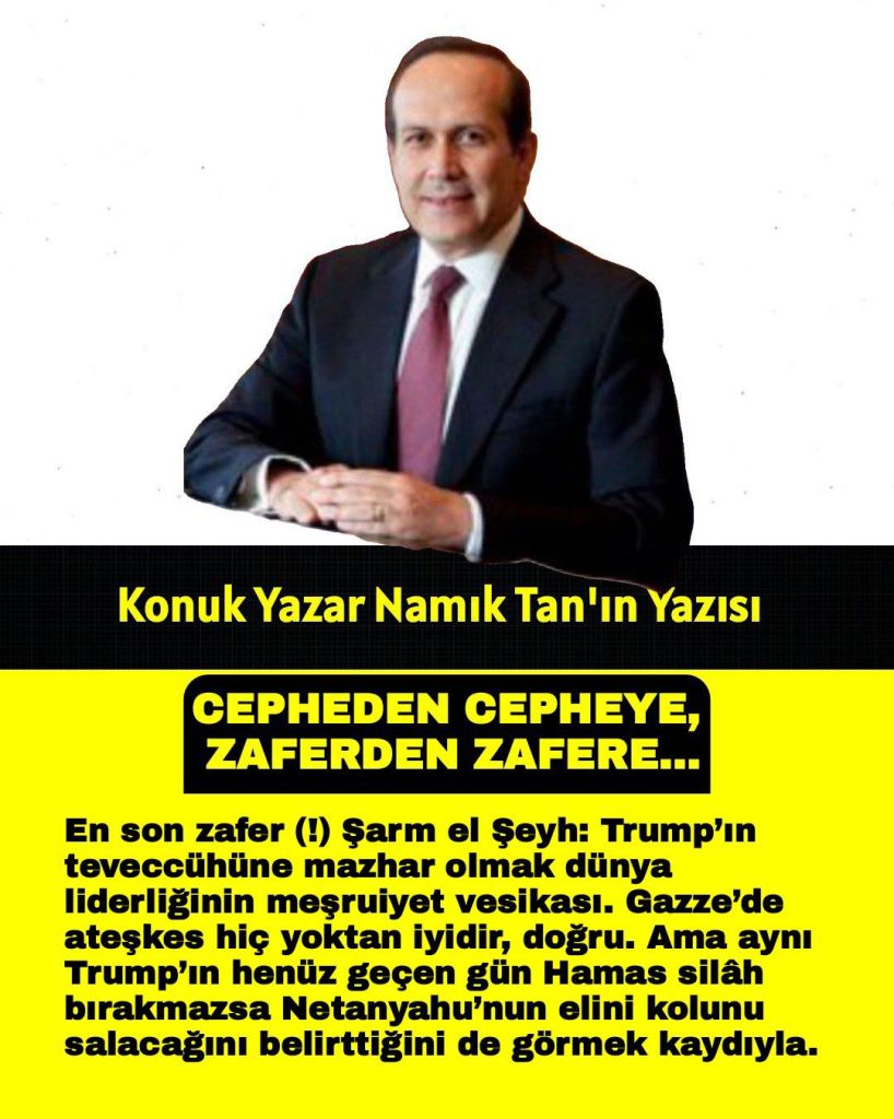 En son zafer (!) Şarm el Şeyh: Trump’ın teveccühüne mazhar olmak dünya liderliğinin meşruiyet vesikası. Gazze’de ateşkes hiç yoktan iyidir, doğru. Ama aynı Trump’ın henüz geçen gün Hamas silâh bırakmazsa Netanyahu’nun elini kolunu salacağını belirttiğini de görmek kaydıyla.