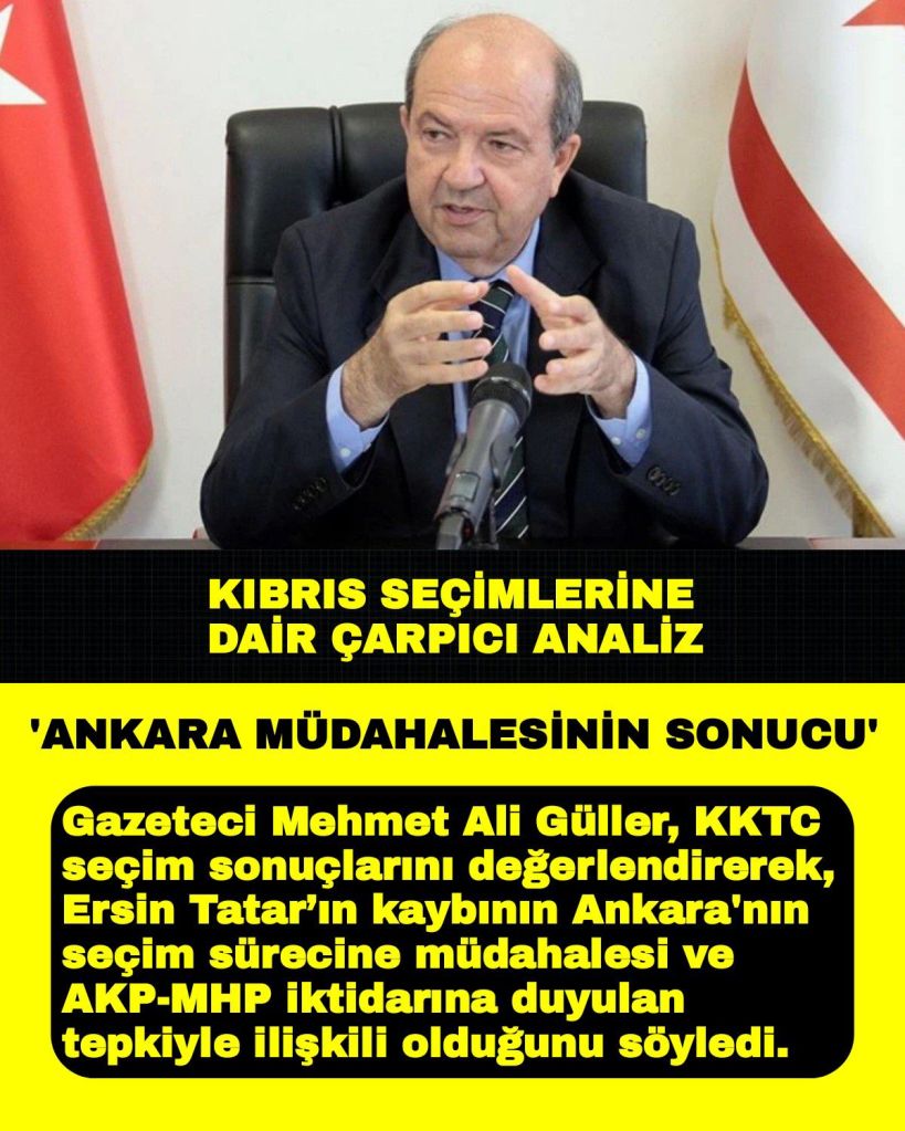 Gazeteci Mehmet Ali Güller, KKTC seçim sonuçlarını değerlendirerek, Ersin Tatar’ın kaybının Ankara’nın seçim sürecine müdahalesi ve AKP-MHP iktidarına duyulan tepkiyle ilişkili olduğunu söyledi.