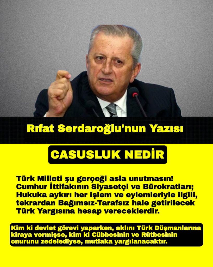 Hukuka aykırı her işlem ve eylemleriyle ilgili, tekrardan Bağımsız-Tarafsız hale getirilecek Türk Yargısına hesap vereceklerdir. Kim ki devlet görevi yaparken, aklını Türk Düşmanlarına kiraya vermişse, kim ki Cübbesinin ve Rütbesinin onurunu zedelediyse, mutlaka yargılanacaktır.