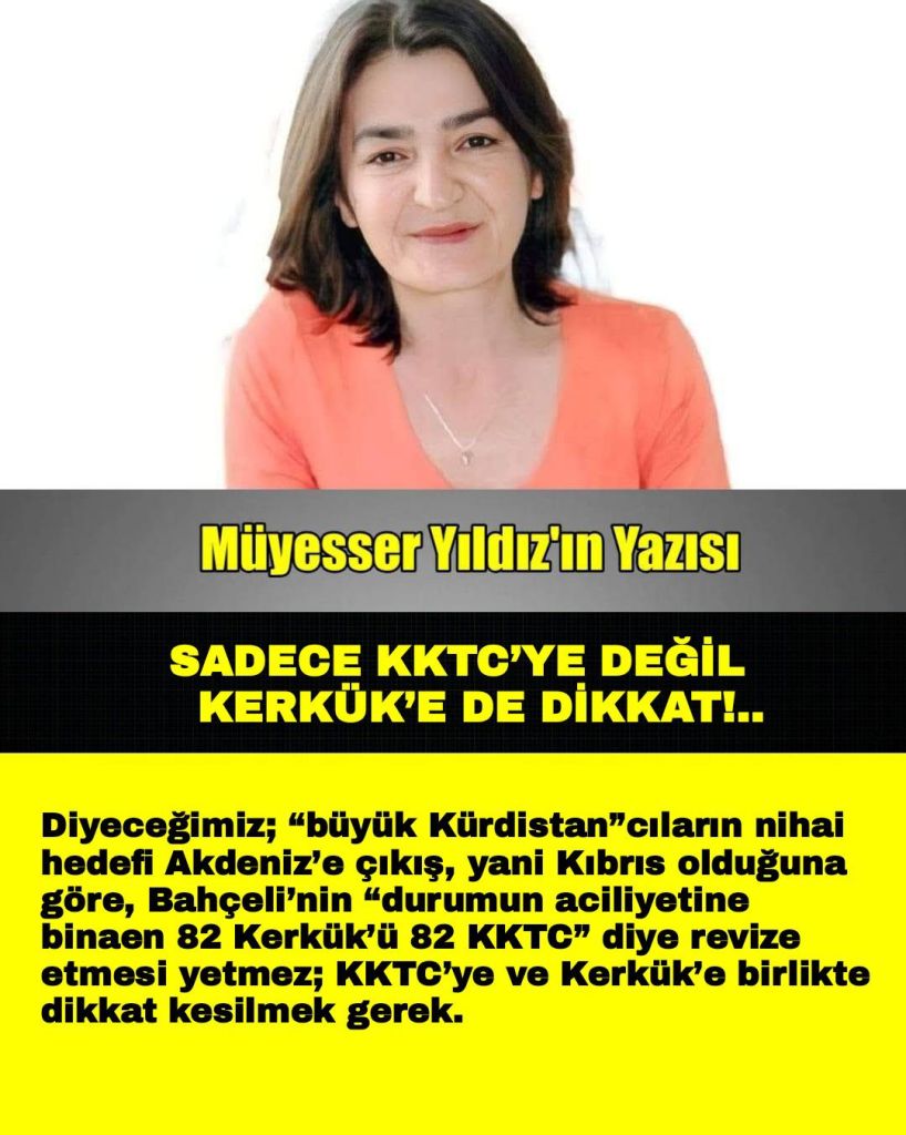 Diyeceğimiz; “büyük Kürdistan”cıların nihai hedefi Akdeniz’e çıkış, yani Kıbrıs olduğuna göre, Bahçeli’nin “durumun aciliyetine binaen 82 Kerkük’ü 82 KKTC” diye revize etmesi yetmez; KKTC’ye ve Kerkük’e birlikte dikkat kesilmek gerek.