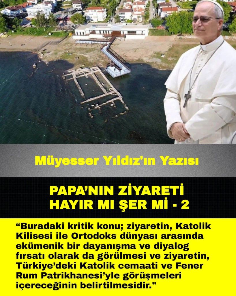 “Buradaki kritik konu; ziyaretin, Katolik Kilisesi ile Ortodoks dünyası arasında ekümenik bir dayanışma ve diyalog fırsatı olarak da görülmesi ve ziyaretin, Türkiye’deki Katolik cemaati ve Fener Rum Patrikhanesi’yle görüşmeleri içereceğinin belirtilmesidir. Bu görüşmelerin Katolik ve Ortodoks dünyası arasında, özellikle de İstanbul Rum Ortodoks Patrikhanesi ile ilişkileri güçlendirme potansiyeli taşıyacağı bilinen bir gerçektir. Patrik Bartholomeos ekümeniklik konusunda yanıp tutuşmakta, ABD başta bu konuda bazı ülkeler de buna destek vermektedir… Bunun, Türkiye’nin güvenliğine olan olumsuz etkisinin biline biline işlendiği görülmektedir… Bir Papa’nın, modern ve Müslüman bir ülke olan Türkiye’deki bu tarihî Hristiyan mekânını ziyaret etmesi, inançlar arası ve jeopolitik semboller olarak, ayrıca hem varlık gösterme hem de tarihsel bir tanıma olarak okunabilir. Fakat Hristiyan dünyası için basit bir tarihi olay olarak da görülmemelidir. 325 yılında Roma İmparatoru Konstantin’in çağrısıyla İznik’te toplanan büyük dini kurul, yalnızca inançla ilgili tartışmaları sonlandırmakla kalmamış, dini siyasetin merkezine yerleştirmiş ve inancı yalnızca ruhani bir mesele olmaktan çıkarıp, imparatorluk yönetiminin aracı haline getirmiş, yani dini resmen siyasallaştırmıştır.”