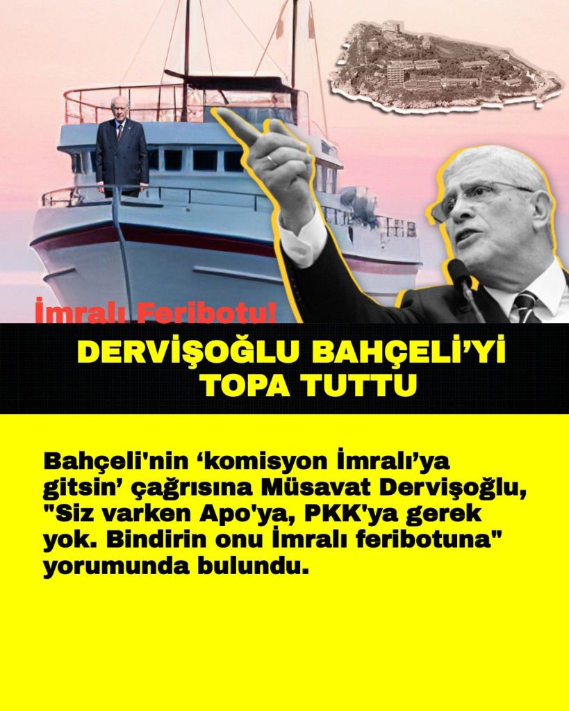 Bahçeli’nin ‘komisyon İmralı’ya gitsin’ çağrısına Müsavat Dervişoğlu, “Siz varken Apo’ya, PKK’ya gerek yok. Bindirin onu İmralı feribotuna” yorumunda bulundu.