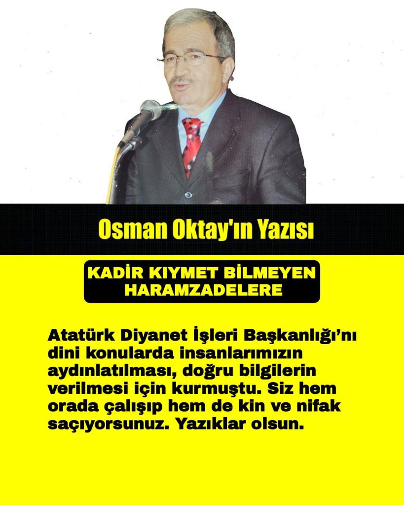Atatürk Diyanet İşleri Başkanlığı’nı dini konularda insanlarımızın aydınlatılması, doğru bilgilerin verilmesi için kurmuştu. Siz hem orada çalışıp hem de kin ve nifak saçıyorsunuz. Yazıklar olsun.