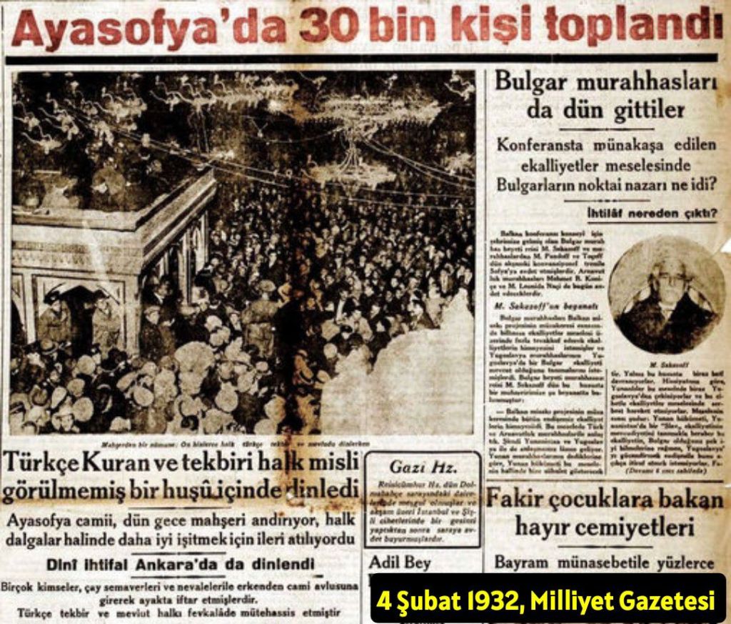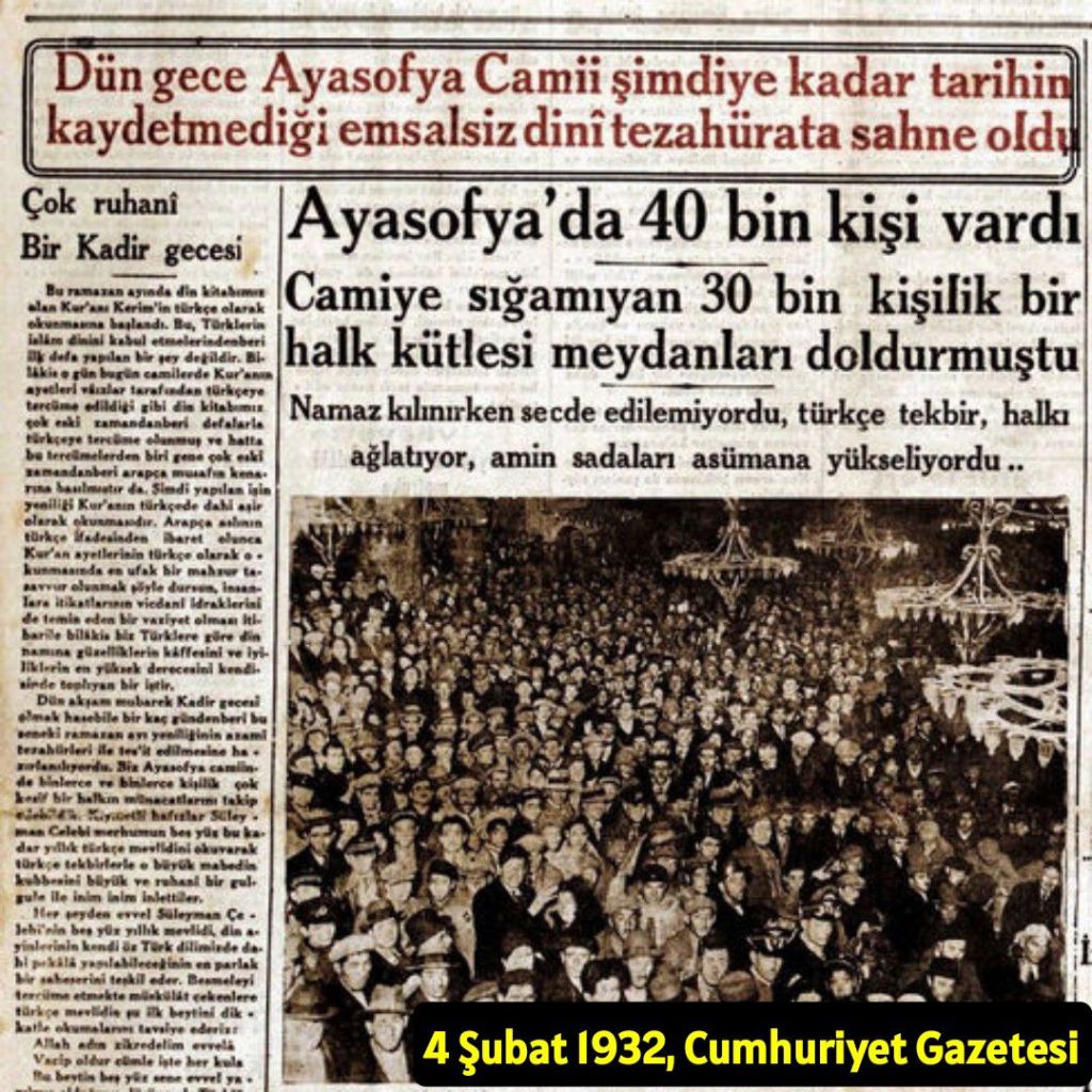 “Ayasofya’da on beş asır boyunca yapılan ibadetler arasında “en fazla reklâm edileni 3 Şubat 1932’deki Kadir Gecesi’ne rastladı. Devrim Türkiyesi’ndeki değişiklikleri duyurmak maksadıyla bir organizasyon düzenlendi, o gece 25 hâfız Türkçe Kur’an okudular, dualar bütün dünyanın dinleyebilmesi için radyodan canlı olarak yayınlandı, şehirlerin meydanlarına hoparlörler yerleştirildi ve Ayasofya’da yabancı diplomatlar da eşleriyle beraber camide hazır bulundular.”