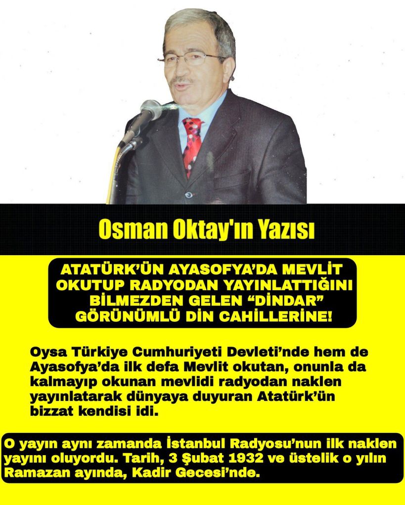 Oysa Türkiye Cumhuriyeti Devleti’nde hem de Ayasofya’da ilk defa Mevlit okutan, onunla da kalmayıp okunan mevlidi radyodan naklen yayınlatarak dünyaya duyuran Atatürk’ün bizzat kendisi idi.