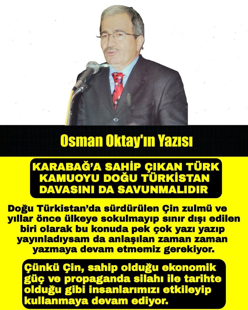 Karabağ bölgesi gibi 76 yıldan beri Çin’in işgali altındadır. Devlet yetkililerimiz ikide bir “Çin’in toprak bütünlüğüne saygılıyız” gibi Doğu Türkistan’da yaşayan 50 milyona yakın ve bizler gibi bu konuda hassas olanları incitecek ifadeler kullanmaktan vazgeçmelidirler. “Çin’in toprak bütünlüğü” denilen yerin 1milyon 828 bin 428 kilometre karesi işgal altındaki Türk toprağıdır.