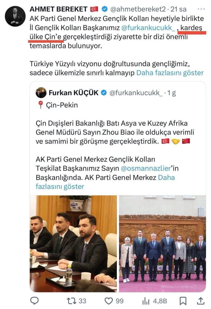 Bununla da kalınsa iyi. İktidardaki Ak Parti’nin Genel Merkez Gençlik Kolları Teşkilat Başkanı Osman Nazlıer’in Başkanlığında İl Gençlik Kolları Başkanı Furkan Küçük’ün de bulunduğu bir heyetin Çin ziyareti, Ahmet Bereket isimli yetkili tarafından kamuoyuna şöyle duyuruldu:
