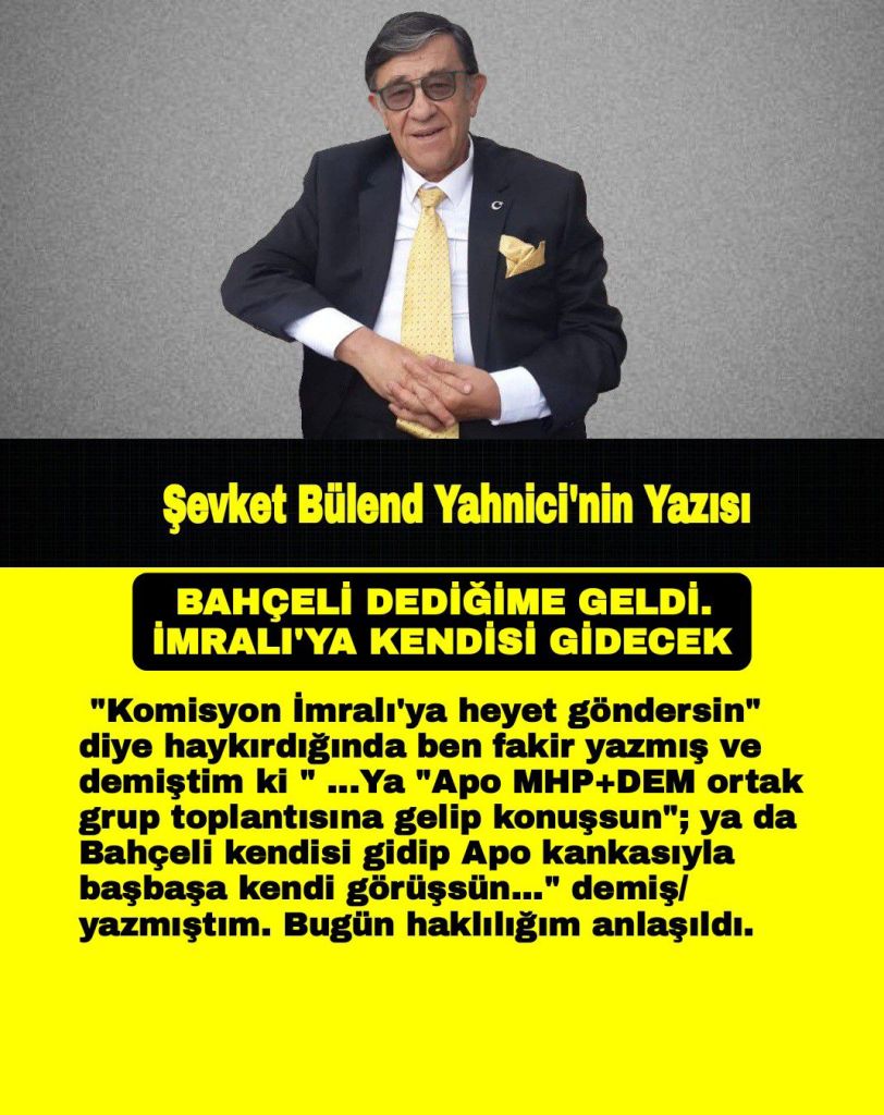 “Komisyon İmralı’ya heyet göndersin” diye haykırdığında ben fakir yazmış ve demiştim ki ” …Ya “Apo MHP+DEM ortak grup toplantısına gelip konuşsun”; ya da Bahçeli kendisi gidip Apo kankasıyla başbaşa kendi görüşsün…” demiş/yazmıştım. Bugün haklılığım anlaşıldı. Kendisi kendisini götürme kararını açıkladı, grubundan da alkışlarla onay aldı. Aslında Bahçeli bu inatla gerekirse mitili Imrali’ya atabilir. Bence orada kalabilir de…