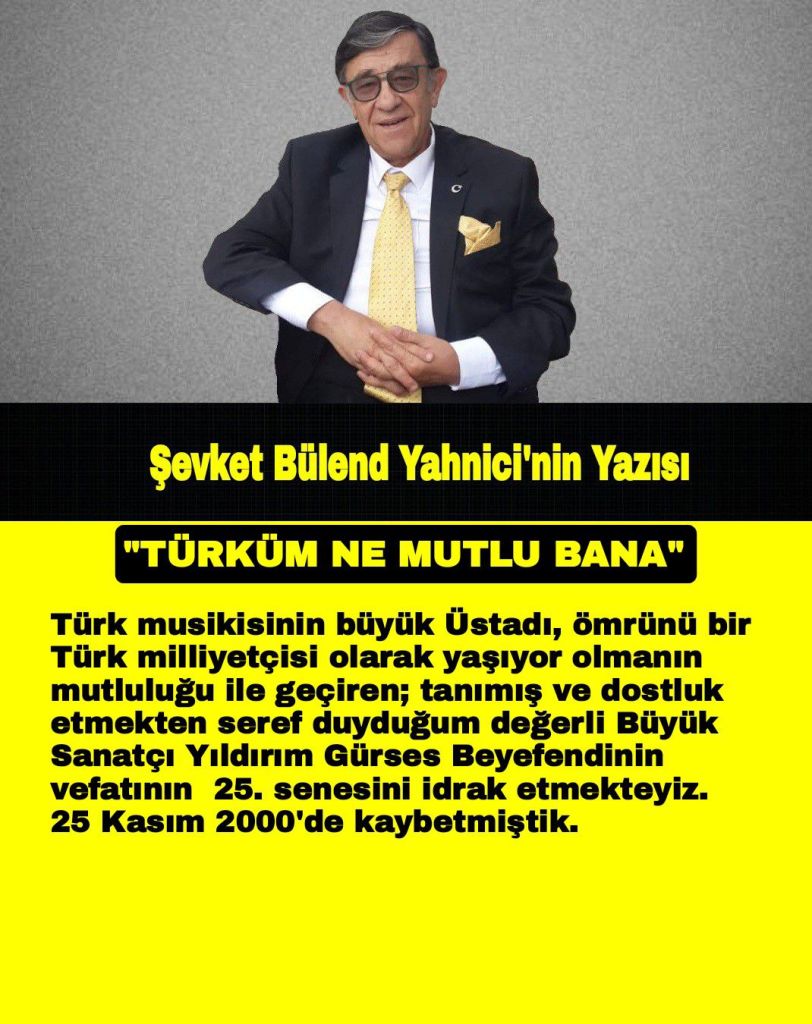 Türk musikisinin büyük Üstadı, ömrünü bir Türk milliyetçisi olarak yaşıyor olmanın mutluluğu ile geçiren; tanımış ve dostluk etmekten seref duyduğum değerli Büyük Sanatçı Yıldırım Gürses Beyefendinin vefatının 25. senesini idrak etmekteyiz. 25 Kasım 2000’de kaybetmiştik. Saygıyla, rahmetle, minnetle anıyor, Allah’tan rahmet diliyorum. “TÜRKÜM NE MUTLU BANA” diyordu. 25 yıl sonra “Ne mutlu Türküm diyene” diyenlerin cezalandırıldığı bir topluma dönüştürüldük. Rahmetli katıldığı MHP gecelerinde de bu şarkıyı büyük şevk ve keyifle okurdu. HALA “TÜRKÜM NE MUTLU BANA” DİYEBİLENLERE GELSİN !.. Yıldırım Gürses söylüyor “eski plakta”…🫶🏻 Güfte de başka bir büyük Türk milliyetçisi dostumun …Halil Soyuer’in…Her ikisine de Fatiha …