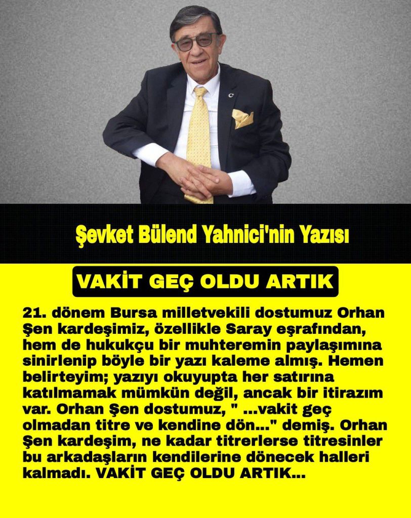 - dönem Bursa milletvekili dostumuz Orhan Şen kardeşimiz, özellikle Saray eşrafından, hem de hukukçu bir muhteremin paylaşımına sinirlenip böyle bir yazı kaleme almış. Hemen belirteyim; yazıyı okuyupta her satırına katılmamak mümkün değil, ancak bir itirazım var. Orhan Şen dostumuz, ” …vakit geç olmadan titre ve kendine dön…” demiş. Orhan Şen kardeşim, ne kadar titrerlerse titresinler bu arkadaşların kendilerine dönecek halleri kalmadı. VAKİT GEÇ OLDU ARTIK…