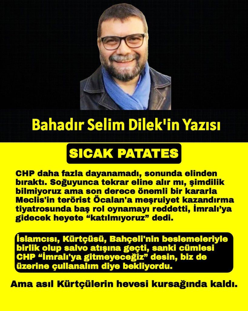 İslamcısı, Kürtçüsü, Bahçeli’nin beslemeleriyle birlik olup salvo atışına geçti, sanki cümlesi CHP “İmralı’ya gitmeyeceğiz” desin, biz de üzerine çullanalım diye bekliyordu.