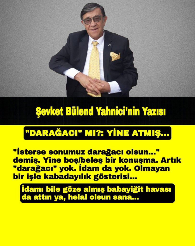 “İsterse sonumuz darağacı olsun…” demiş. Yine boş/beleş bir konuşma. Artık “darağacı” yok. İdam da yok. Olmayan bir işle kabadayılık gösterisi…